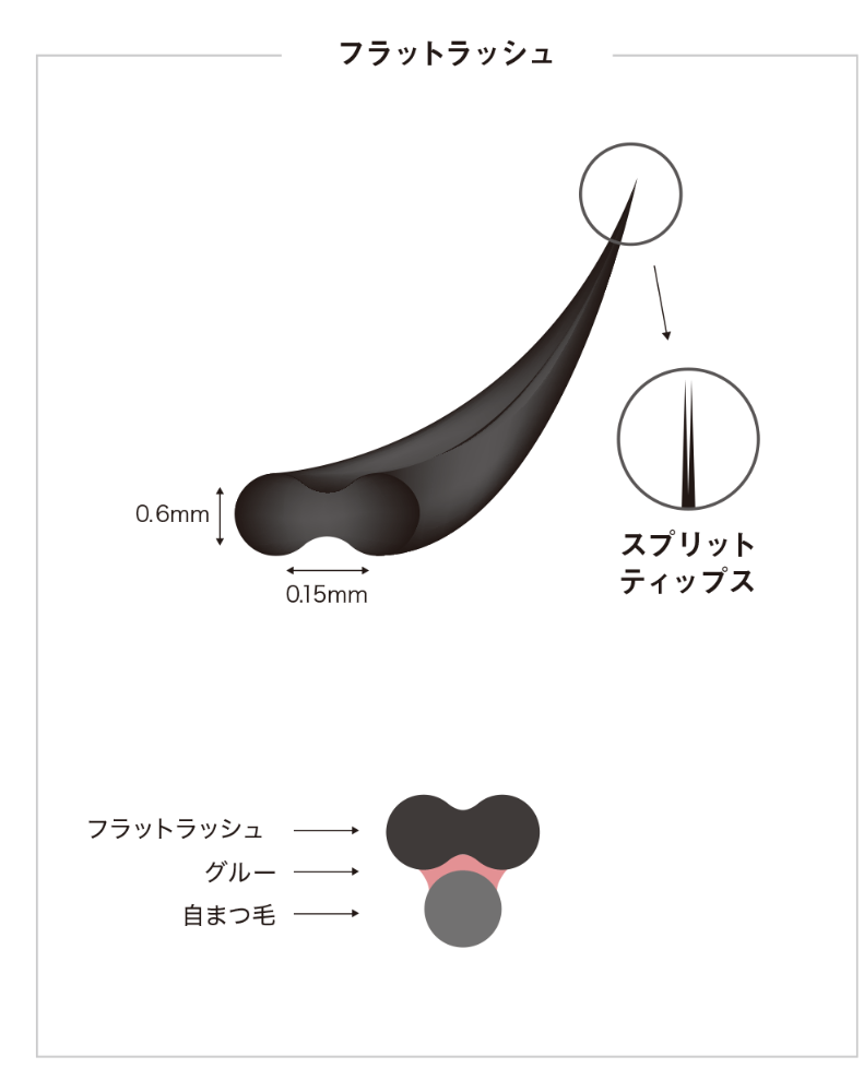 フラットラッシュは通常のエクステに比べて軽く自まつ毛の負担を軽減します。エクステに窪みがあるので自まつ毛と密着するので持続性抜群です♡